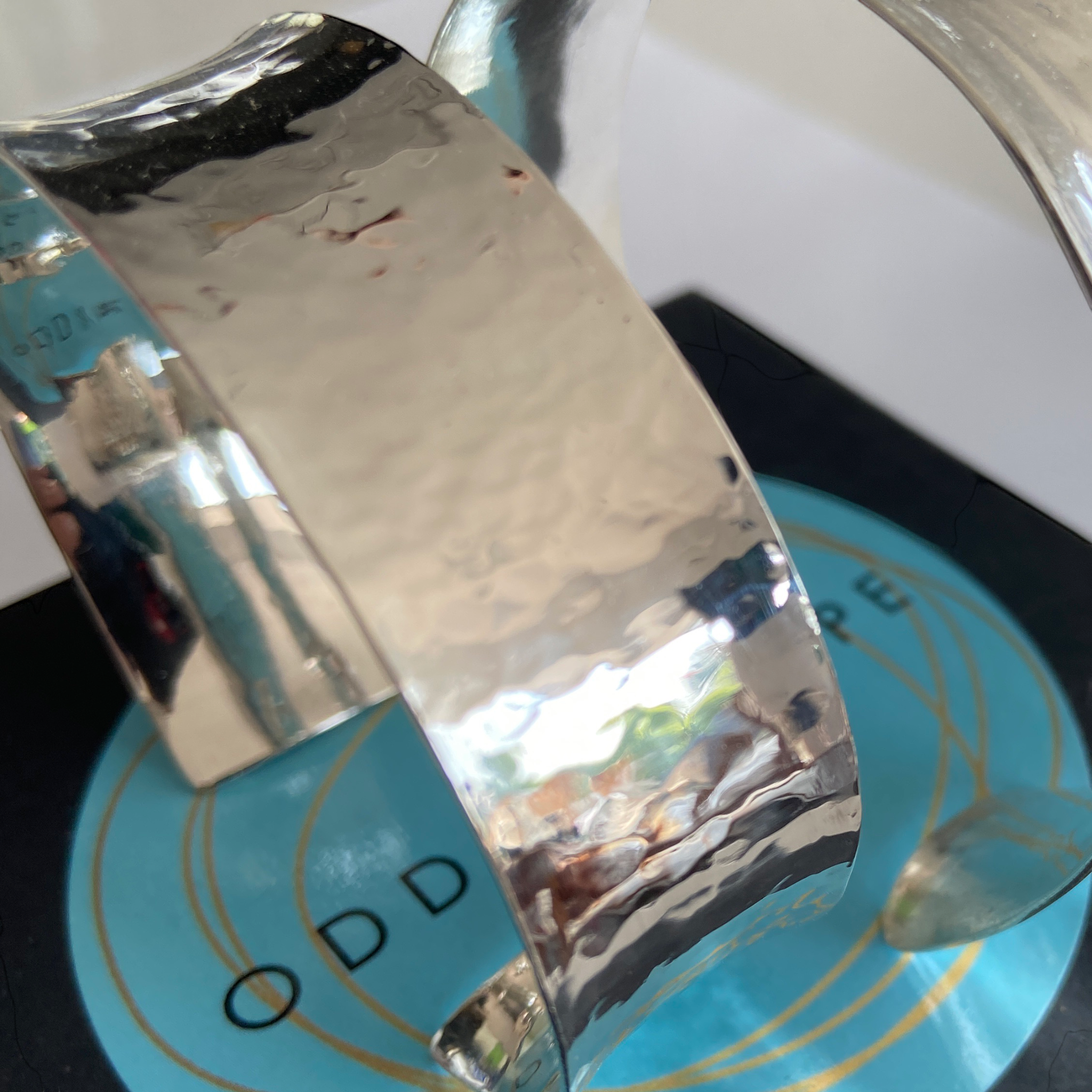 Sterling silver. Hand-hammered finish. Store carefully and polish lightly when needed.