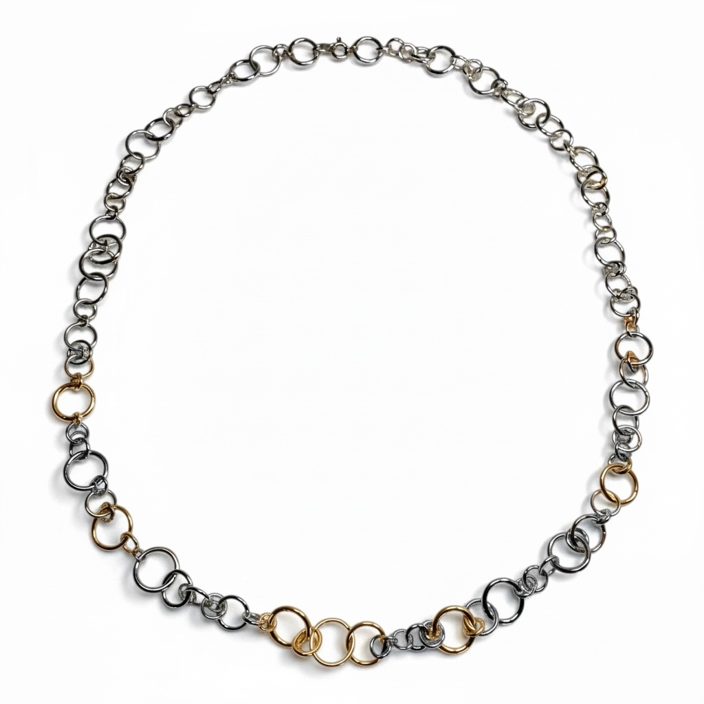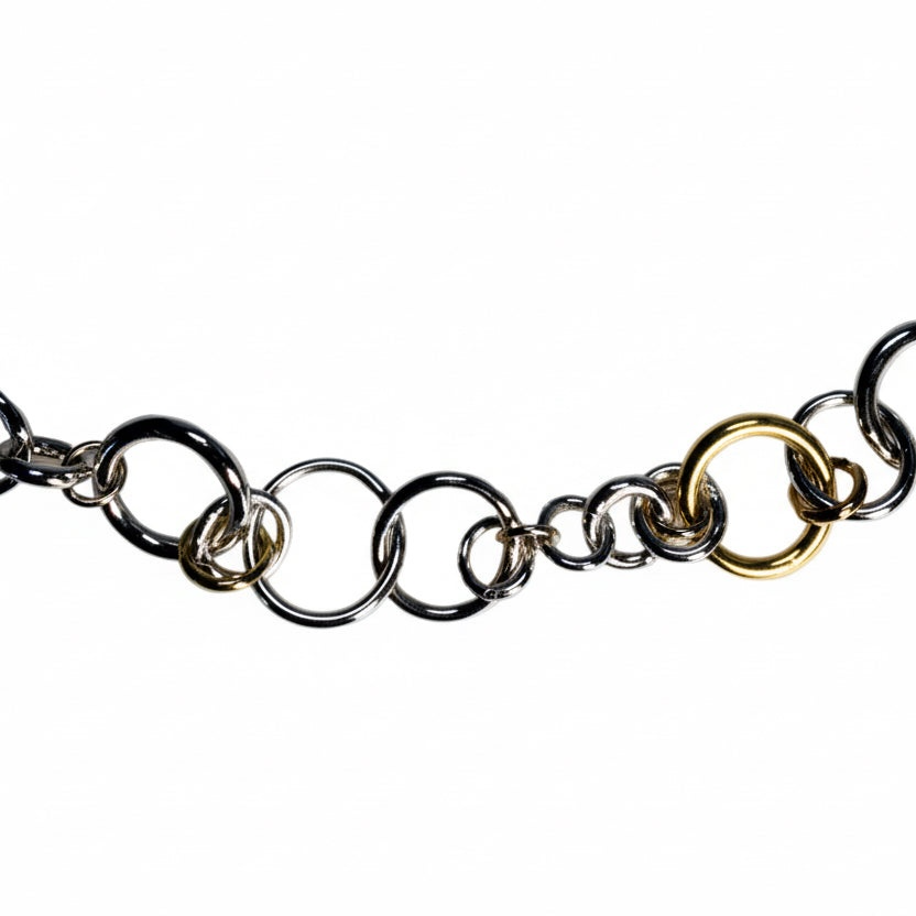 The Links chain necklace is formed from individual rings either in sterling silver together with 14ct gold, 9ct gold and 18ct gold interlinked in a random pattern. Each ring is soldered by hand, with the deliberate solder join left visible to celebrate the handmade construction.