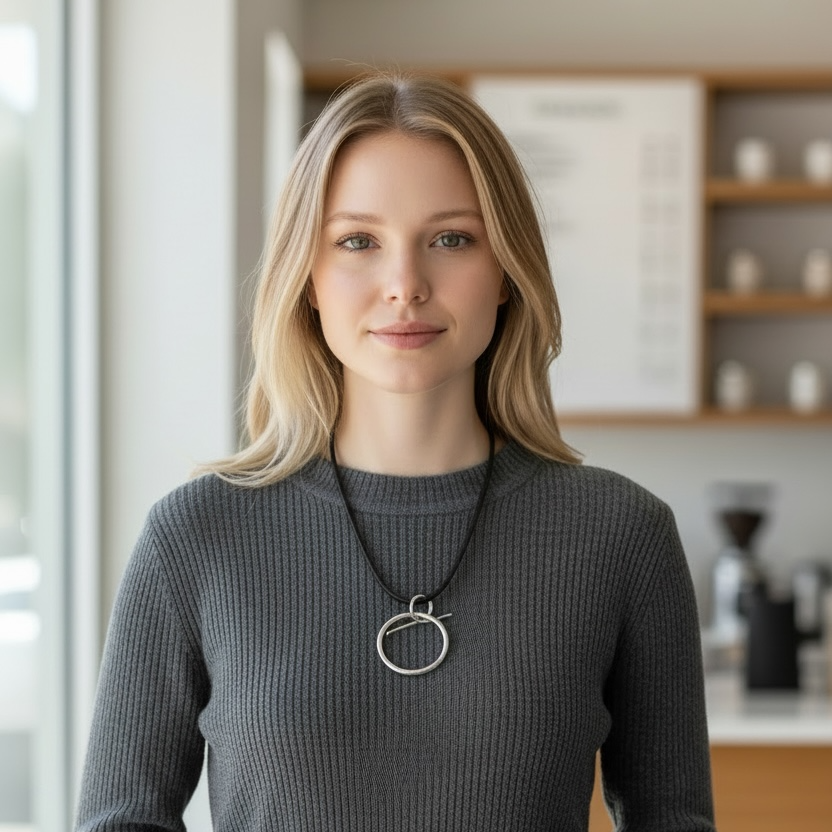 The circle is suspended from a contemporary twisted hook fitting and worn on a sleek rubber necklet, secured with a sterling silver clasp. Minimal yet striking, the design balances strong form with effortless wearability.