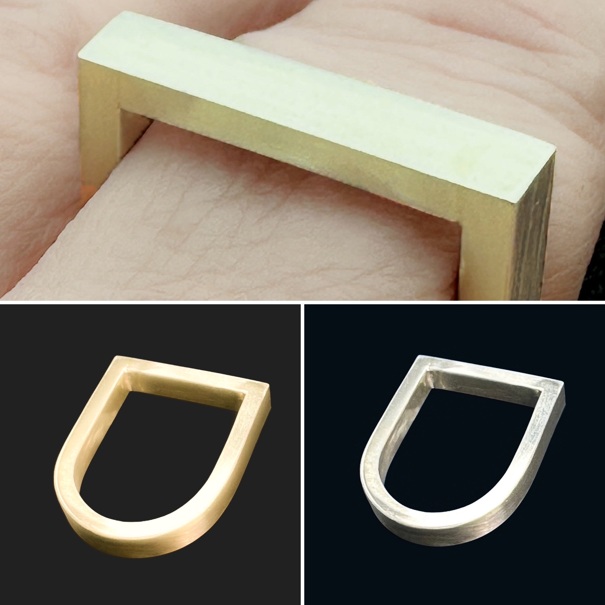 Modern clean lines are reflected in these hand-formed U shape straight bar geometric rings handset with precious rubies and sapphires